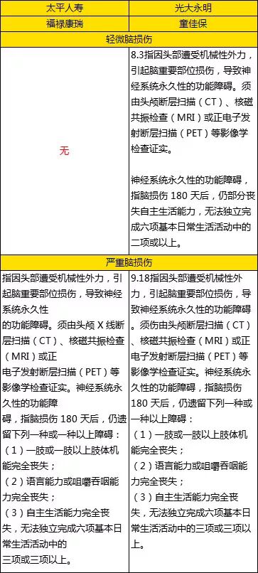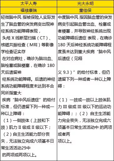 關(guān)于輕微腦中風(fēng)的理賠,都是在確診180天后。光大永明童佳保定義為中癥賠付保額的50%,要求遺留一肢或一肢以上肢體肌力III級(jí)或III級(jí)以下的運(yùn)動(dòng)功能障礙。III級(jí)的水平是還能抵抗地心引力,自己還可以抬手抬腳,還能動(dòng)的狀態(tài)。而太平福祿康瑞重大疾病輕微腦中風(fēng)的理賠是最為嚴(yán)格需遺留一側(cè)肢體(上肢和下肢)肌力2級(jí)或2級(jí)以下的運(yùn)動(dòng)功能障礙;II級(jí)就是無(wú)法抵抗地心引力,手或腳都無(wú)法自行抬起。且僅賠付保額20%。